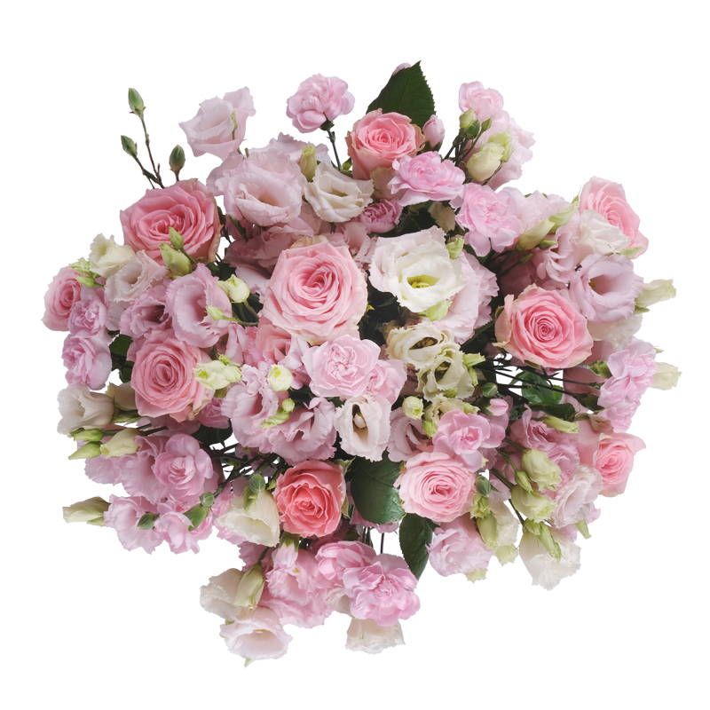 Kompozycja z różowych róż, eustom i goździków tworzy bukiet „Połączenie idealne” – subtelny, lekki, idealny na każdą okazję. Bilecik doda mu indywidualnego charakteru.